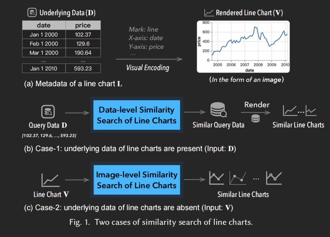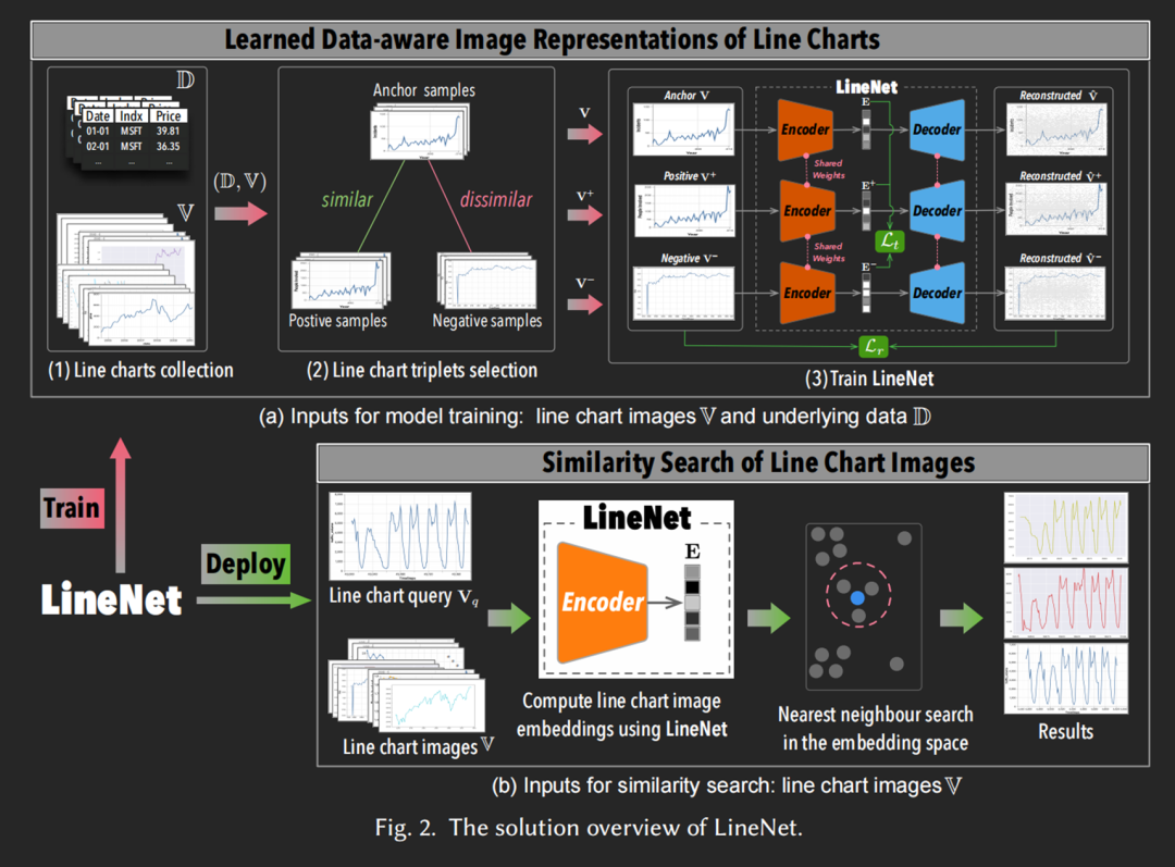 在该文中,作者研究了查询时只有线形图像可用的场景。作者的目标是训练一个神经网络,使其能够将这些线形图像转化为能够反映生成这些线形图的底层数据的表示,从而学习到更好的表示。作者的关键想法是,作者可以在训练阶段收集数据和线形图像,以学习这样的神经网络,而在查询(或推理)阶段,支持仅提供线形图像的情况。为此,作者提出了LineNet,一个基于视觉转换器的三重自编码器模型,用于学习数据感知的线形图图像表示以进行相似度搜索。作者设计了一种新颖的伪标签选择机制,以引导LineNet捕捉线形图的既包含数据感知又包含图像级相似度的特征。作者进一步提出了一种多样化的训练样本选择策略,以优化学习过程并提高性能。作者进行了定量评估和案例研究,结果表明,LineNet在搜索相似线形图像方面显著优于现有的最先进方法。