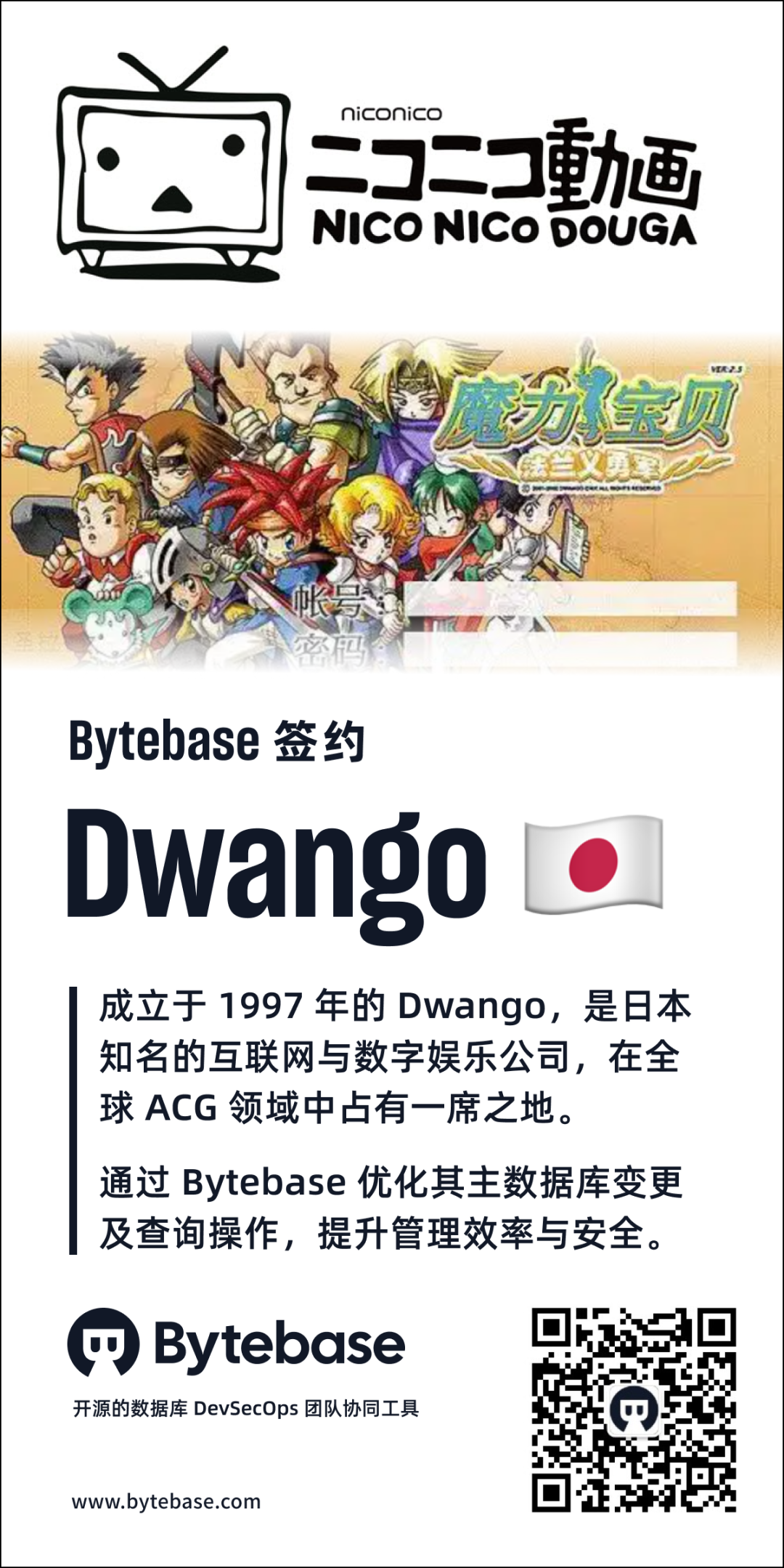 为了提升数据库管理的效率与安全,Dwango 选择了 Bytebase 来优化其数据库变更与查询操作。Bytebase 通过一体化的数据库 CI/CD 流程,简化了数据库变更管理,涵盖了 SQL 审核策略、自定义审批流、批量变更、一键回滚及历史查询等功能,确保了数据库操作的准确性与流畅性。此外,Bytebase 还提供了强大的数据安全保障措施,包括访问权限控制、动态数据脱敏以及行为审计等,确保 Dwango 在高效管理数据库的同时,满足了数据安全与合规性要求。这些功能的协同作用,在提升数据库操作效率和可靠性的同时,大幅降低了数据管理过程中可能出现的风险,为 Dwango 的业务持续增长奠定基础。