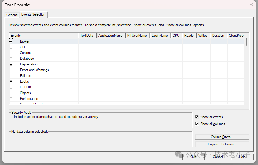 点击“事件选择”选项卡,确保选中了“Show all events”和“Show all columns”复选框。