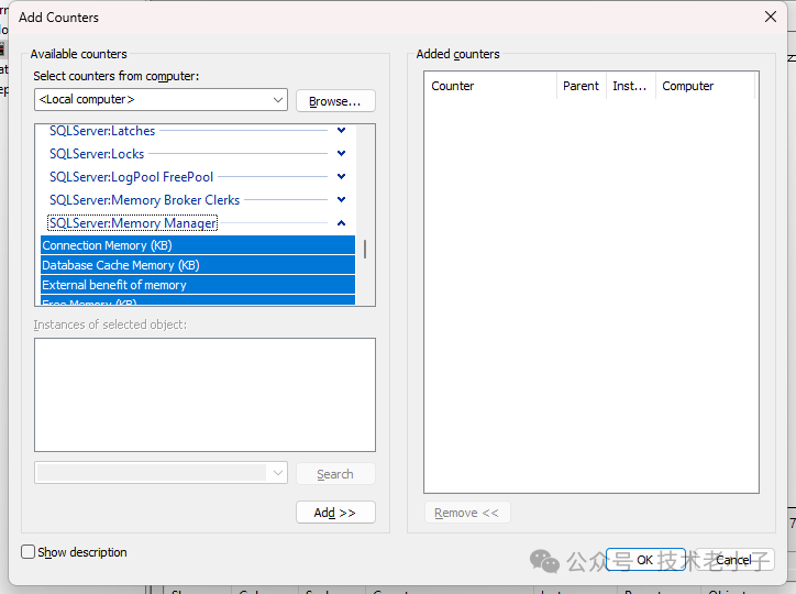 在“添加计数器”对话框中,从列表中选择“SQLServer:General Statistics”和“SQLServer:Memory Manager”对象。