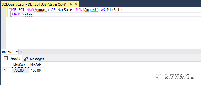 SELECT MAX(Amount) AS MaxSale, MIN(Amount) AS MinSale