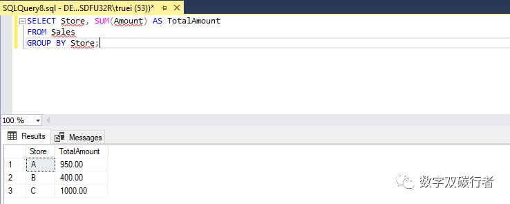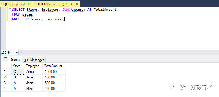 SELECT Store, Employee, SUM(Amount) AS TotalAmount