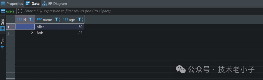 INSERT INTO users (id, name, age)VALUES (1, 'Alice', 30), (2, 'Bob', 25);