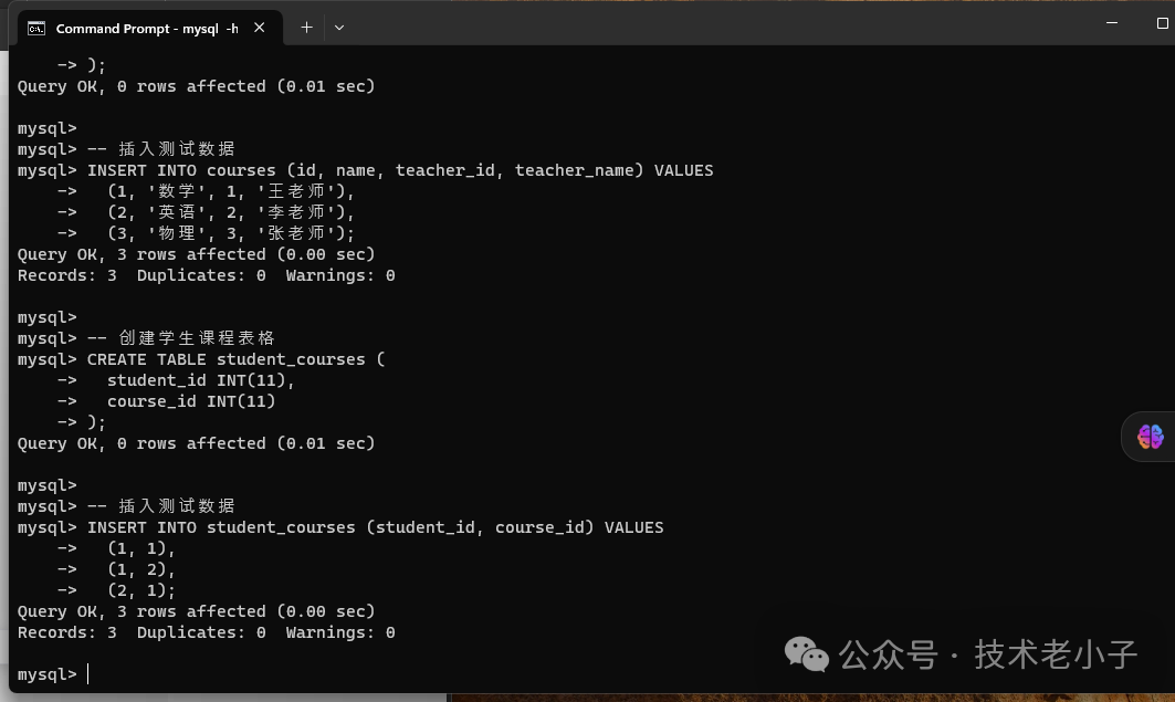 -- 创建学生表格CREATE TABLE students (id INT(11) PRIMARY KEY,name VARCHAR(100),age INT(11),phone VARCHAR(20));-- 插入测试数据INSERT INTO students (id, name, age, phone) VALUES(1, '张三', 20, '1234567890'),(2, '李四', 22, '9876543210'),(3, '王五', 21, '5555555555');-- 创建课程表格CREATE TABLE courses (id INT(11) PRIMARY KEY,name VARCHAR(100),teacher_id INT(11),teacher_name VARCHAR(100));-- 插入测试数据INSERT INTO courses (id, name, teacher_id, teacher_name) VALUES(1, '数学', 1, '王老师'),(2, '英语', 2, '李老师'),(3, '物理', 3, '张老师');-- 创建学生课程表格CREATE TABLE student_courses (student_id INT(11),course_id INT(11));-- 插入测试数据INSERT INTO student_courses (student_id, course_id) VALUES(1, 1),(1, 2),(2, 1);