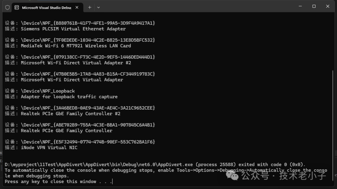 using SharpPcap;class Program{static void Main(string[] args){获取所有可用的捕获设备var devices = CaptureDeviceList.Instance;打印每个设备的信息foreach (var dev in devices){Console.WriteLine($"设备: {dev.Name}");Console.WriteLine($"描述: {dev.Description}");Console.WriteLine();}}}