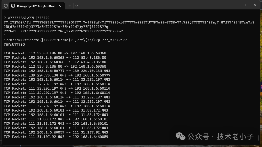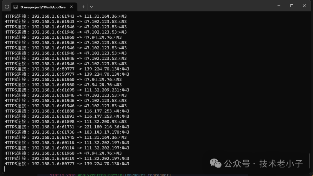 using System;using System.Text;using PacketDotNet;using SharpPcap;class Program{static void Main(string[] args){// 获取第一个网络接口using var device = CaptureDeviceList.Instance[6];device.Open(mode: DeviceModes.Promiscuous, read_timeout: 1000);// 设置过滤器捕获HTTP和HTTPS流量device.Filter = "tcp port 80 or tcp port 443";device.OnPacketArrival += (sender, e) =>{var rawPacket = e.GetPacket();var packet = Packet.ParsePacket(rawPacket.LinkLayerType, rawPacket.Data);if (packet is EthernetPacket ethernetPacket){var ipPacket = ethernetPacket.PayloadPacket as IPPacket;var tcpPacket = ipPacket?.PayloadPacket as TcpPacket;if (tcpPacket != null && tcpPacket.PayloadData != null && tcpPacket.PayloadData.Length > 0){if (tcpPacket.DestinationPort == 80){AnalyzeHttpTraffic(tcpPacket);}else if (tcpPacket.DestinationPort == 443){AnalyzeHttpsTraffic(tcpPacket);}}}};device.StartCapture();Console.WriteLine("正在捕获HTTP和HTTPS流量,按任意键停止...");Console.ReadKey();device.StopCapture();}static void AnalyzeHttpTraffic(TcpPacket tcpPacket){string payload = Encoding.ASCII.GetString(tcpPacket.PayloadData);if (payload.StartsWith("GET") || payload.StartsWith("POST") || payload.StartsWith("PUT") || payload.StartsWith("DELETE")){string[] lines = payload.Split('\n');string requestLine = lines[0].Trim();string[] parts = requestLine.Split(' ');if (parts.Length >= 2){string method = parts[0];string url = parts[1];Console.WriteLine($"HTTP请求: {method} {url}");}}}static void AnalyzeHttpsTraffic(TcpPacket tcpPacket){// 获取 IP 包var ipPacket = (IPPacket)tcpPacket.ParentPacket;if (ipPacket != null){// 从 IP 包获取源和目标地址var sourceAddress = ipPacket.SourceAddress;var destinationAddress = ipPacket.DestinationAddress;// 从 TCP 包获取源和目标端口var sourcePort = tcpPacket.SourcePort;var destinationPort = tcpPacket.DestinationPort;Console.WriteLine($"HTTPS连接: {sourceAddress}:{sourcePort} -> {destinationAddress}:{destinationPort}");// 检查 TLS 握手包if (tcpPacket.PayloadData != null && tcpPacket.PayloadData.Length > 0 && tcpPacket.PayloadData[0] == 0x16){Console.WriteLine("检测到TLS握手包");}}else{Console.WriteLine("无法获取 IP 包信息");}}}