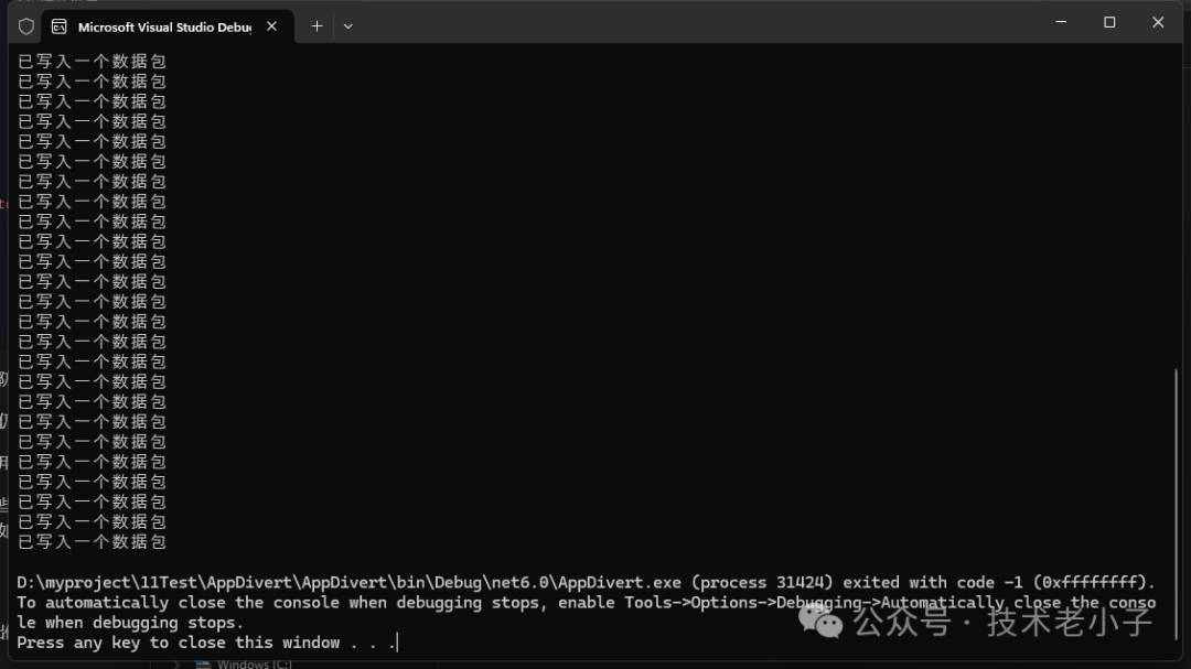 using System;using SharpPcap;using PacketDotNet;class Program{static void Main(string[] args){// 获取第一个网络接口using var device = CaptureDeviceList.Instance[0];// 打开设备device.Open(mode: DeviceModes.Promiscuous, read_timeout: 1000);// 创建捕获文件写入器using var writer = new CaptureFileWriterDevice("capture.pcap");writer.Open(device);// 设置数据包到达事件处理device.OnPacketArrival += (sender, e) =>{writer.Write(e.GetPacket());Console.WriteLine("已写入一个数据包");};// 开始捕获device.StartCapture();Console.WriteLine("正在捕获数据包,按任意键停止...");Console.ReadKey();// 停止捕获device.StopCapture();}}
