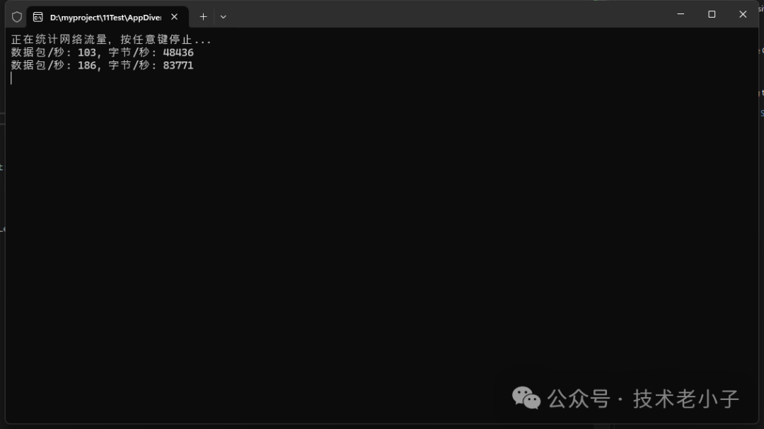using System;using System.Threading;using SharpPcap;class Program{static long packetCount = 0;static long byteCount = 0;static void Main(string[] args){// 获取第一个网络接口using var device = CaptureDeviceList.Instance[6];device.Open(mode: DeviceModes.Promiscuous, read_timeout: 1000);device.OnPacketArrival += (sender, e) =>{Interlocked.Increment(ref packetCount);Interlocked.Add(ref byteCount, e.GetPacket().Data.Length);};// 启动统计线程var statsThread = new Thread(PrintStats);statsThread.Start();device.StartCapture();Console.WriteLine("正在统计网络流量,按任意键停止...");Console.ReadKey();device.StopCapture();statsThread.Join();}static void PrintStats(){long lastPacketCount = 0;long lastByteCount = 0;while (true){Thread.Sleep(1000);long currentPacketCount = Interlocked.Read(ref packetCount);long currentByteCount = Interlocked.Read(ref byteCount);long packetsPerSecond = currentPacketCount - lastPacketCount;long bytesPerSecond = currentByteCount - lastByteCount;Console.WriteLine($"数据包/秒: {packetsPerSecond}, 字节/秒: {bytesPerSecond}");lastPacketCount = currentPacketCount;lastByteCount = currentByteCount;}}}