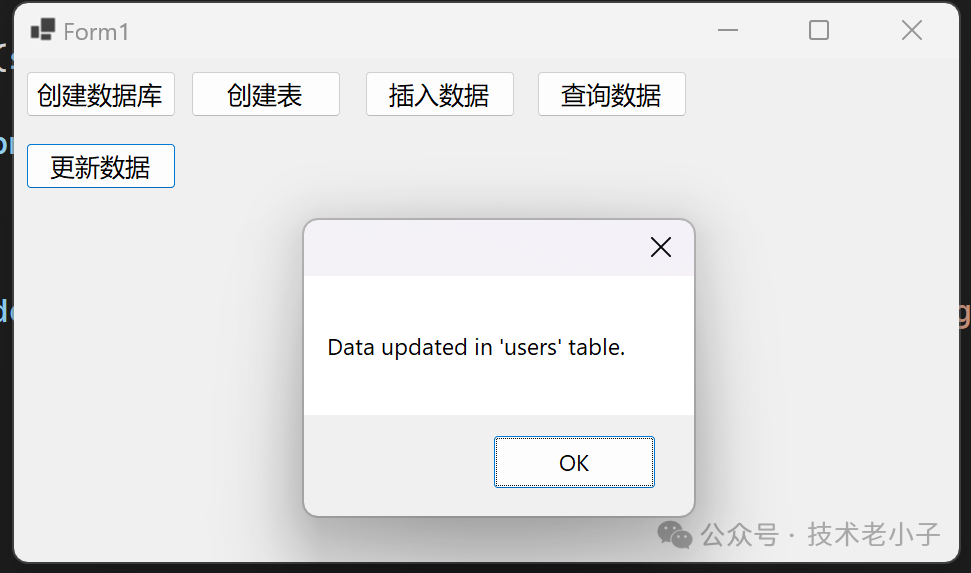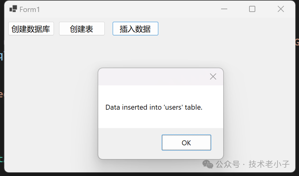 private void btnInsert_Click(object sender, EventArgs e){string connectionString = "Data Source=demo.db;Version=3;";using (var connection = new SQLiteConnection(connectionString)){connection.Open();string sql = "INSERT INTO users (name, age) VALUES ('Alice', 30)";using (var command = new SQLiteCommand(sql, connection)){command.ExecuteNonQuery();MessageBox.Show("Data inserted into 'users' table.");}}}