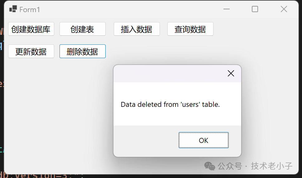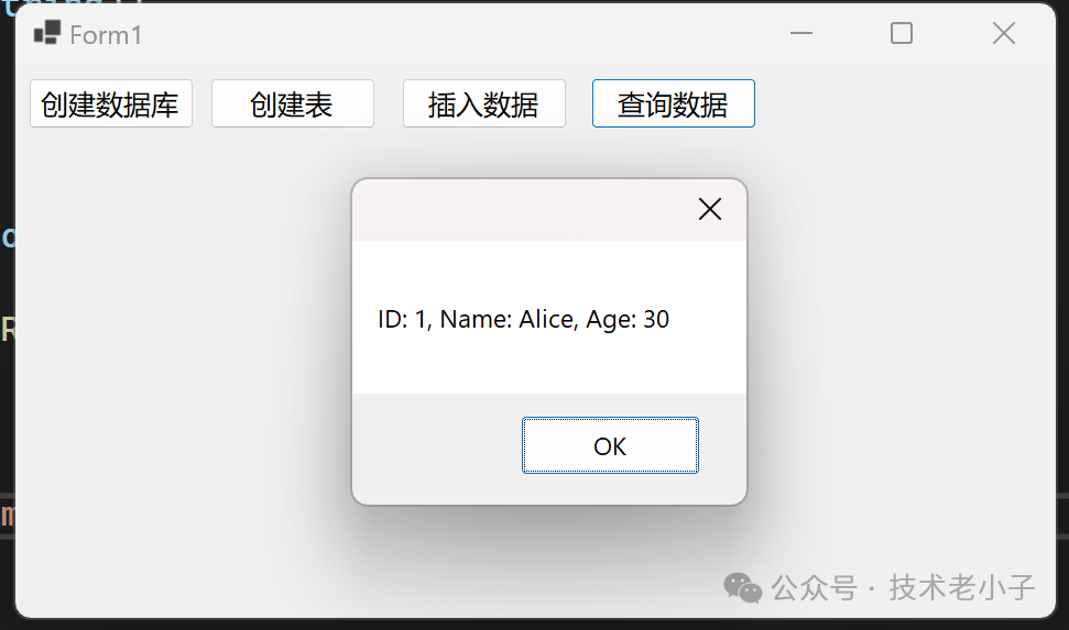 private void btnQuery_Click(object sender, EventArgs e){string connectionString = "Data Source=demo.db;Version=3;";using (var connection = new SQLiteConnection(connectionString)){connection.Open();string sql = "SELECT * FROM users";using (var command = new SQLiteCommand(sql, connection)){using (SQLiteDataReader reader = command.ExecuteReader()){while (reader.Read()){MessageBox.Show($"ID: {reader["id"]}, Name: {reader["name"]}, Age: {reader["age"]}");}}}}}