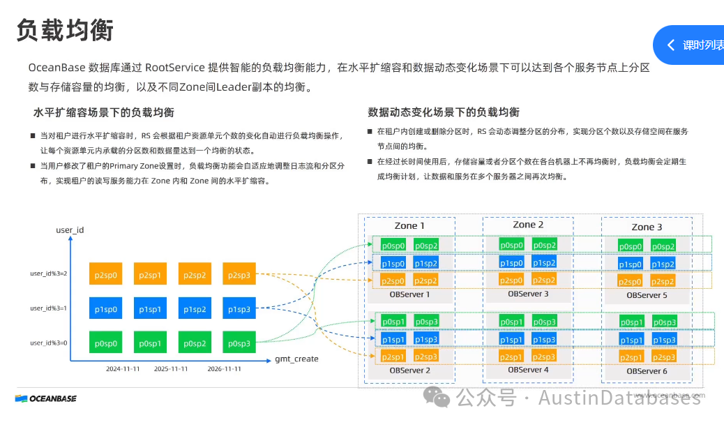 自动负载均衡能力:OceanBase通过RS服务实现了自动的负载均衡能力。在数据库水平扩缩容与创建分区的场景下,可以达到各个服务节点上分区数与存储容量的均衡,以及不同中间分区数量的均衡。