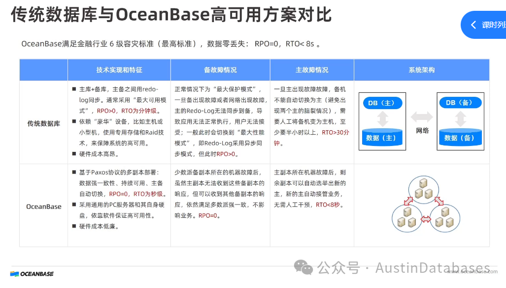 在 V4 版本,OceanBase 进一步提升了高可用能力,在数据零丢失及 RPO 等于零的基础上,将服务恢复时间缩短到了 8 秒以及 RTO<8 秒,树立了行业的新标准。