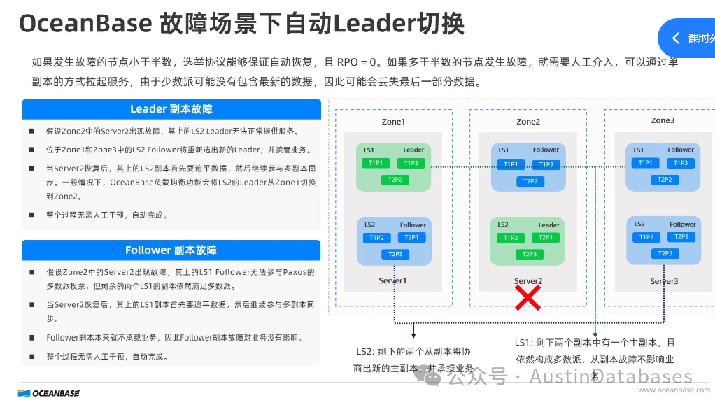 当主副本出现故障时,OceanBase 会自动从从副本中选举出新的主副本。