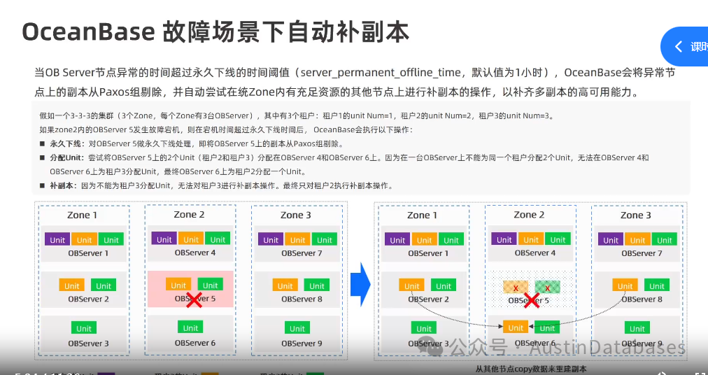 副本重建:OceanBase会在同一个可用区内的其他Observer节点上重建这些副本。由于一个可用区内只能有一个副本,补副本操作只能在发生故障的可用区内进行。