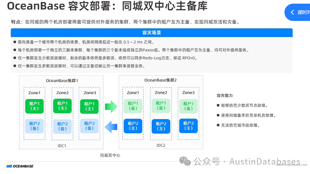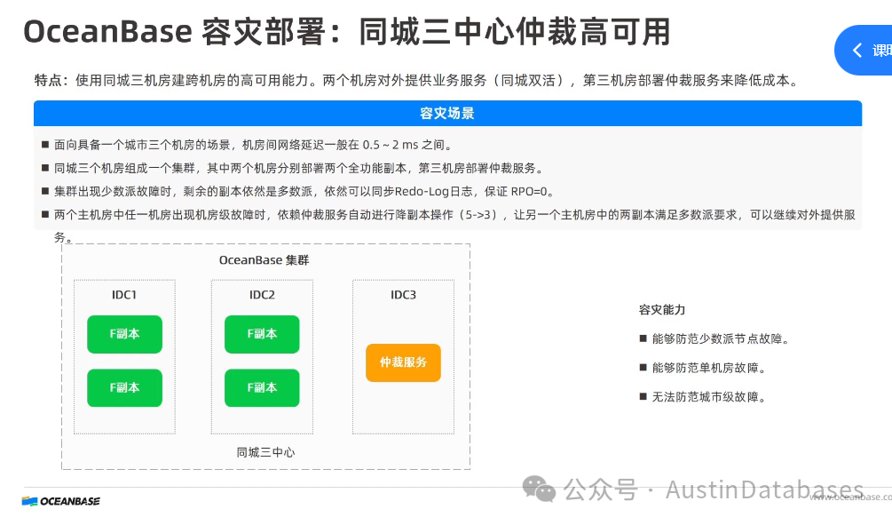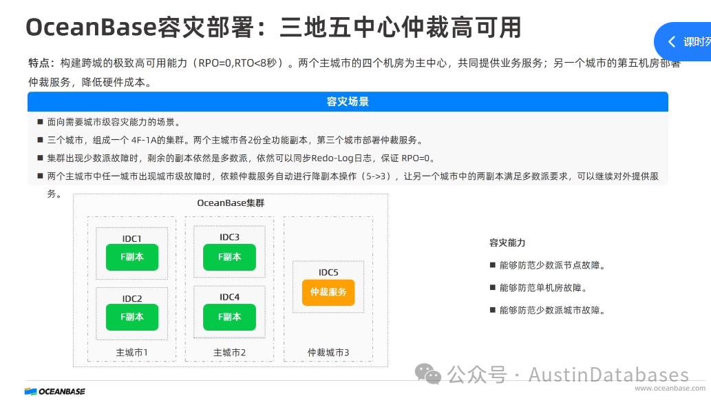 OceanBase 的同城双中心主备、同城三中心仲裁和三地五中心仲裁的容灾部署方案具有以下特点: