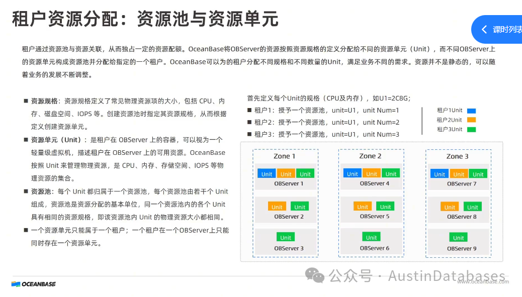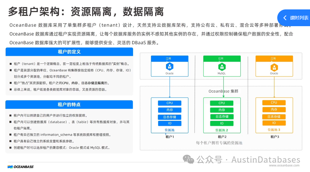 1 多租户架构:OceanBase 采用多租户架构,允许在一个数据库集群内划分多个业务租户,以此实现资源和数据的隔离. 每个租户的资源以资源池的形式进行分配,对于应用程序来说,这就像是独立的数据库实例。