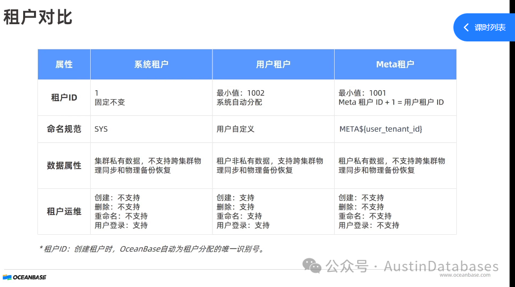 因此,当前版本对用户可见的租户有三种类型:系统租户、用户租户以及 Meta 租户。