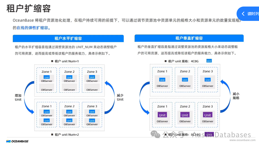 OceanBase集群涉及租户和集群的扩缩容,并通过修改租户的资源单元个数来改变可用区下服务于该租户的observer个数。