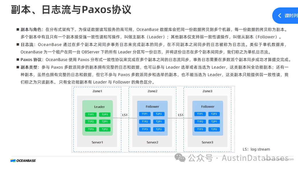 OceanBase通过多副本实现高可用性,日志流用于副本间的数据同步,而Paxos协议是保证数据一致性的基础