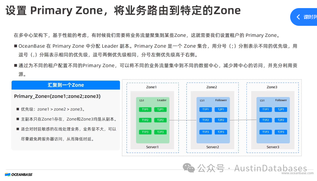 数据分布和流量控制:通过合理设置 Primary Zone,可以控制数据分布和业务流量,在多地多中心的部署场景中尤其有用。