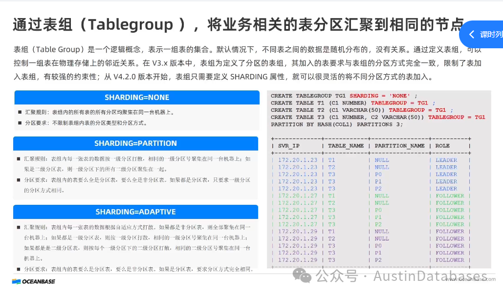 SHARDING=DUPLICATED:OceanBase 会将表组内的所有表和分区都聚集在相同的 Observer 上,它们的 leader 副本也聚集在同一台 Observer 上,对于应用来说,表组内的表提供了类似集中式数据库的访问性能。