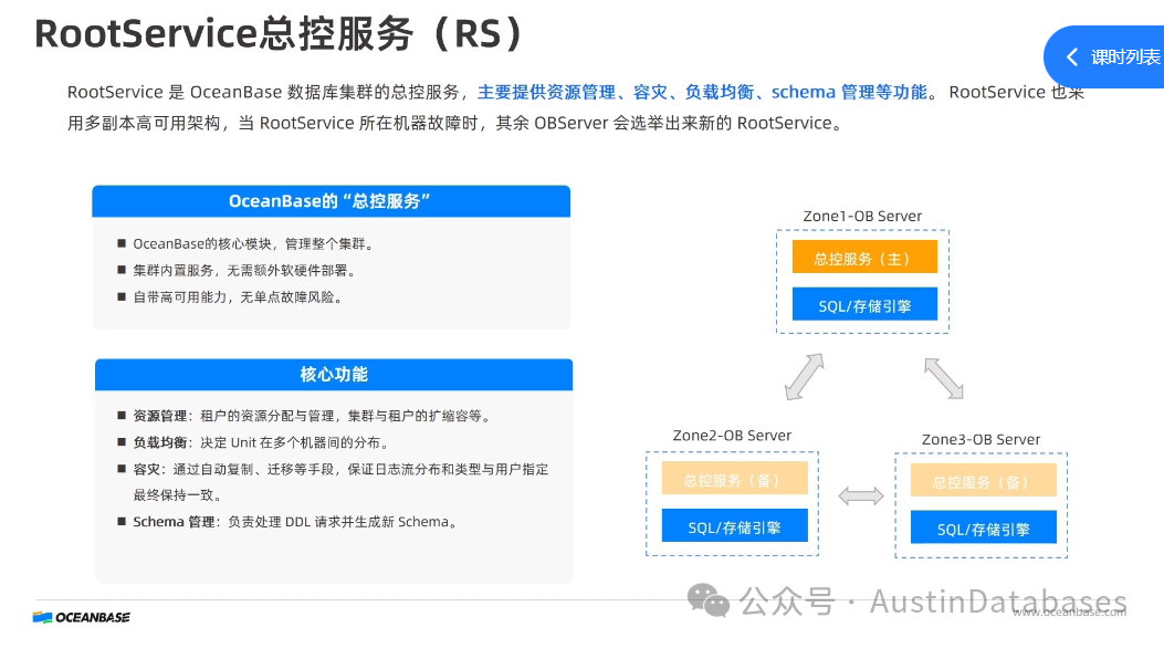 8 Root Service: Root Service 是 OceanBase 的核心模块,提供资源管理、容灾、负载均衡和 DDL 管理等功能. RS 负责租户的资源分配与管理,集群与租户的扩缩容,以及将租户的资源单元和 leader 节点合理地分布在不同的 observer 节点上,以达到负载均衡的目的。