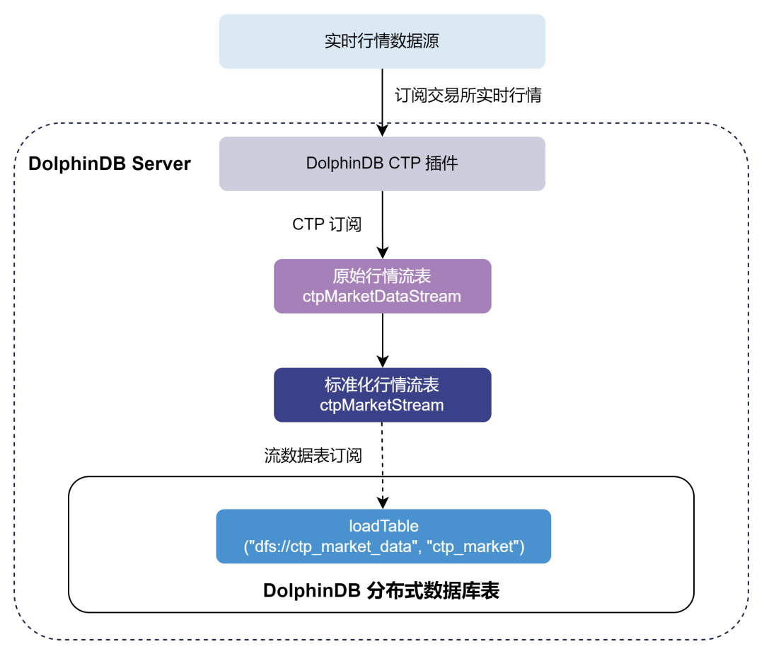 为实现 CTP 行情数据与数据库的高效对接,我们基于官方 CTP C++ API 开发了 DolphinDB CTP 行情插件,将复杂的 CTP 原生接口封装为易用的脚本函数。目前,DolphinDB CTP 插件同时支持 CTP 标准版与 CTPMini 版接口,用户可以通过灵活配置实现行情数据的全自动化采集与存储。大致流程如下: