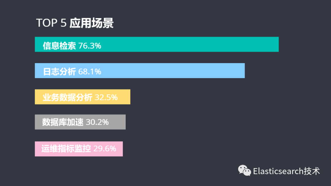信息检索和日志分析占实际应用场景的大壁江山,业务数据分析、数据库加速、运维指标监控三者平分秋色。