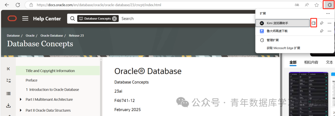 在当今数字化飞速发展的时代,掌握强大的数据库技术成为了众多 IT 从业者和数据爱好者的关键技能。而 Oracle 数据库作为行业内的佼佼者,其官方文档蕴含着海量且权威的知识宝藏。然而,面对繁杂的文档内容,很多人可能会感到无从下手。幸运的是,Kimi 的浏览器插件为我们开启了一扇便捷学习 Oracle 官方文档的大门,今天就让我们一同深入了解如何安装这一实用的插件,开启高效学习之旅。