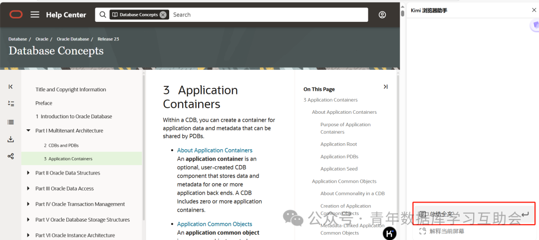 通过上述简单的步骤,安装 Kimi 的浏览器插件来学习 Oracle 官方文档便轻松达成。这个插件就像是我们探索 Oracle 知识世界的得力助手,它将复杂的文档学习过程变得更加直观、有序和高效。无论是初入 Oracle 领域的新手,还是希望进一步深挖知识的专业人士,都能借助它更好地汲取官方文档中的精华,不断提升自己在 Oracle 数据库方面的技能水平,为未来的技术发展和个人职业成长奠定坚实的基础,让我们充分利用好这一工具,在 Oracle 的知识海洋中畅游吧。