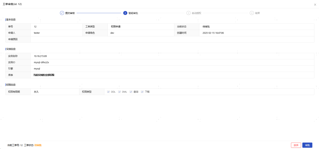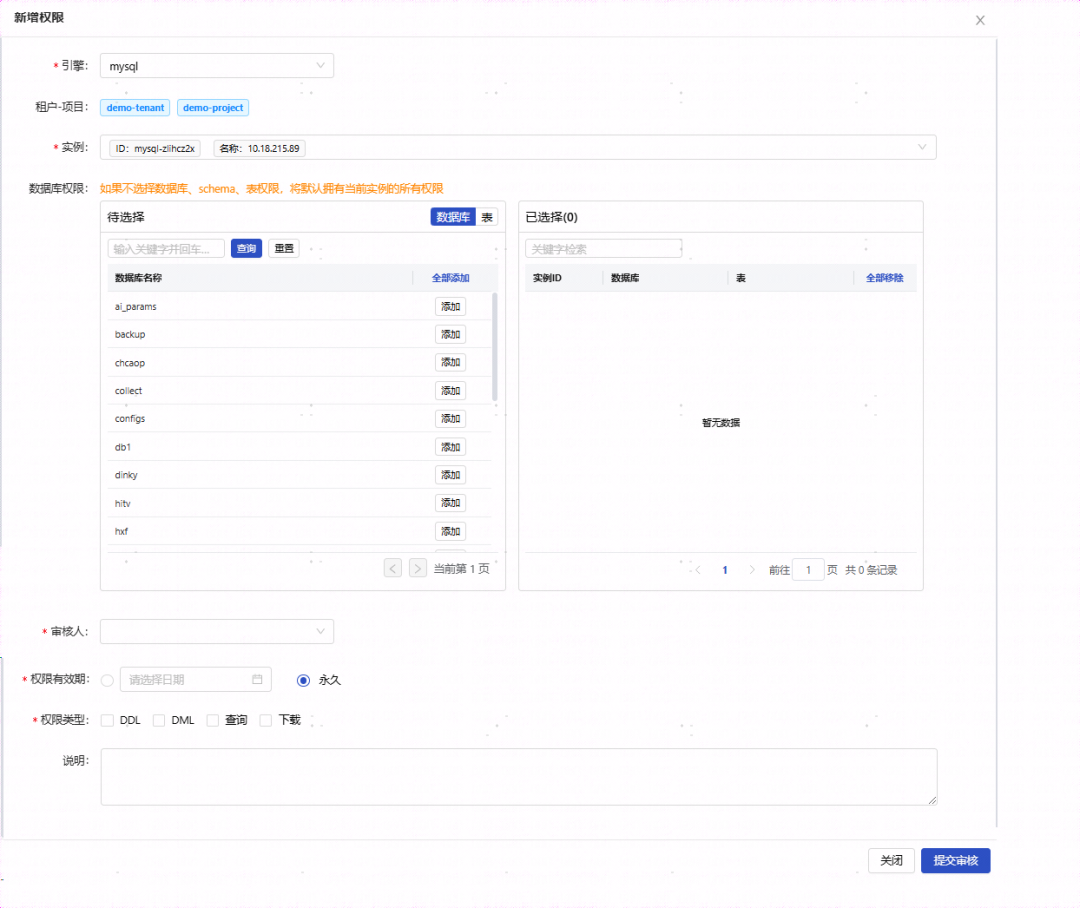 细粒度权限控制:支持按数据库、库、表等不同层级申请权限,精确到DDL、DML或查询操作权限,满足企业多样化、精细化的管理需求,避免权限过大或过小带来的风险。