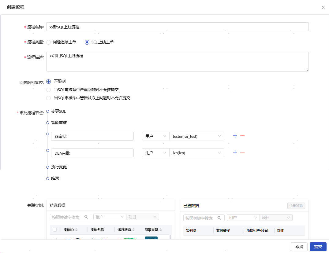 平台可以针对不同的数据库实例设置不同的上线流程,支持针对不同的数据库设置各自的问题管控级别和审批流程节点。