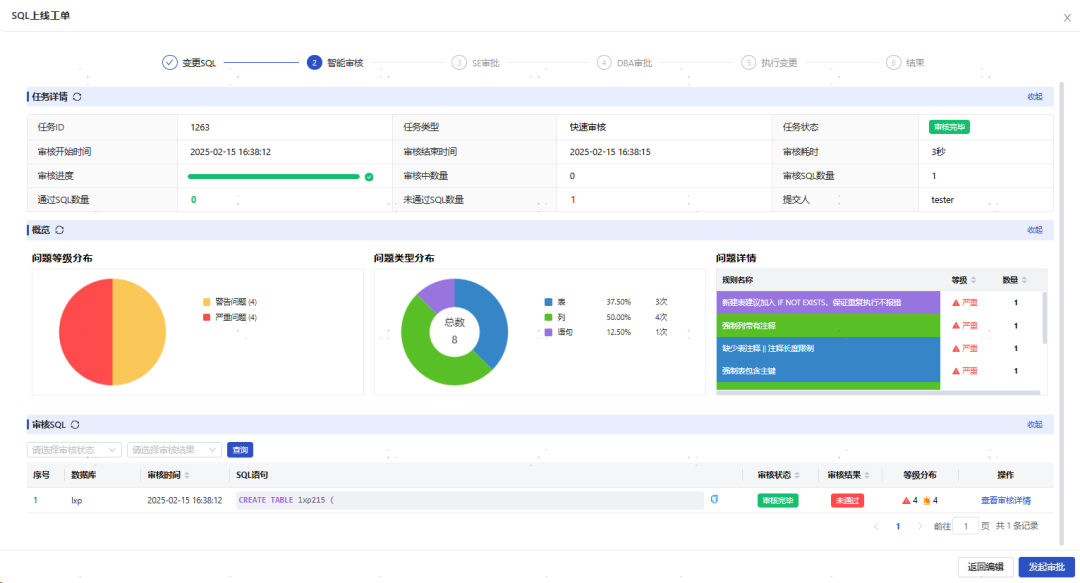 在平台中,用户只需在数据库实例左侧选择 【SQL变更发布】菜单,即可快速创建工单。平台根据预设的自定义流程,自动生成对应工单,并完成智能审核、多级审批和SQL 执行,实现变更流程的自动化闭环管理。