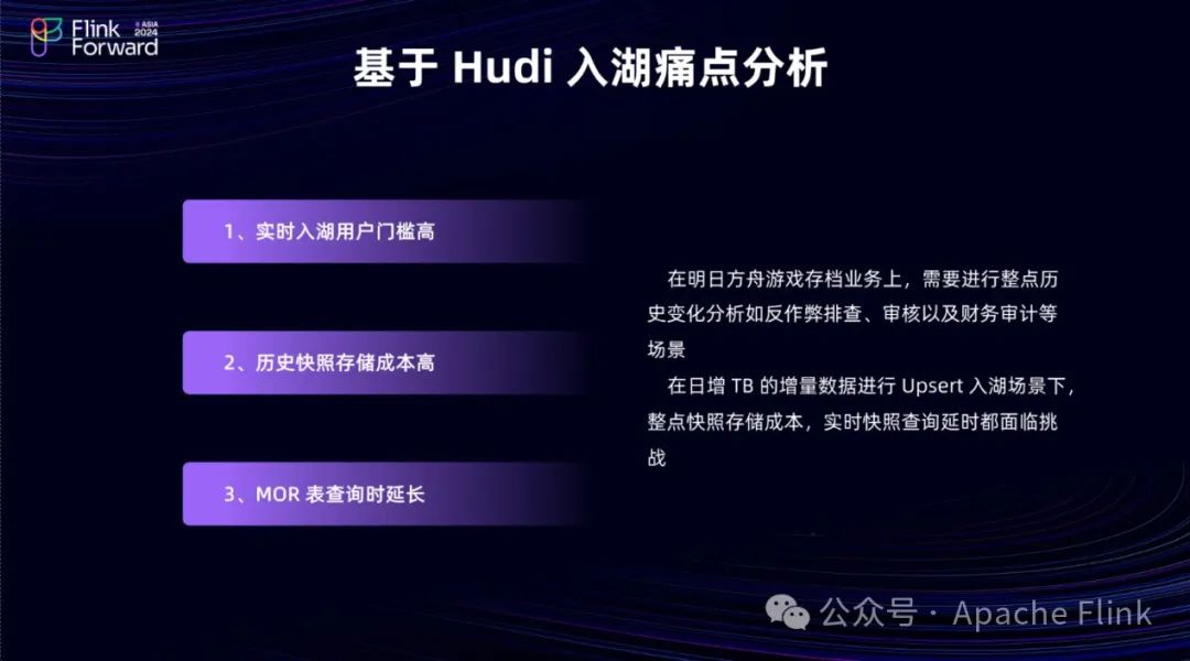 在采用 Paimon 之前,鹰角网络曾基于 Hudi 构建数据湖以进行数据入湖分析。在《明日方舟》的游戏存档业务中,需要进行整点历史变化分析,例如反作弊的排查审核和财务审计相关的业务需求。在这个存档业务场景中,日增量数据大约达到 TB 级别,需要进行 Upsert 操作以将数据入湖。由于数据量巨大,整点快照的存储成本在 Hudi 场景下可能呈现翻倍增长。