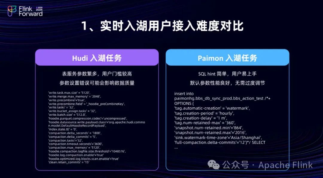 首先介绍实时数据入湖与用户接入难度的对比。从左侧的这两个示例中,可以看到在相同存档场景下, Hudi 入湖表服务的配置参数。在配置过程中, Hudi 需要进行多项设置,例如 Write 相关算子的并发度设置、索引压缩以及表服务参数配置,如 Clean 相关的表服务设置等。相比之下,在 Paimon 入湖传递中, Write 算子相关的设置可能主要集中在并发度上。至于 Compaction 的参数配置,可能仅需设置 Full-compaction 拍摄的 Delta-commits 数量,而其余部分则多与业务相关。例如,需要保留多久的 Tag,以及 Snapshot 的保留周期有多长等。对于初级数据开发人员来说,他们实际上可以轻松地完成这些简单且高效的入湖参数配置。