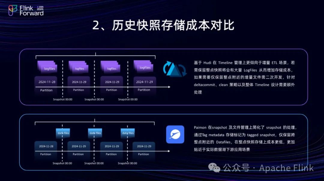 第 2 点是关于历史快照存储成本的对比。假设每天需要在零点整点时刻存储快照,在 Hudi 的场景中,它更倾向于处理增量数据的场景。如果保留整点快照,将会有大量的 Log Files 存储在 OSS 中。如果仅需要保留整点附近的 Log Files,则需要对 Hudi 进行二次开发。首先,要调整其 Delta Commit 和 Clean 策略;其次,要对整个 Timeline 体系进行额外处理。这种做法实际上开发以及运维成本会比较高。