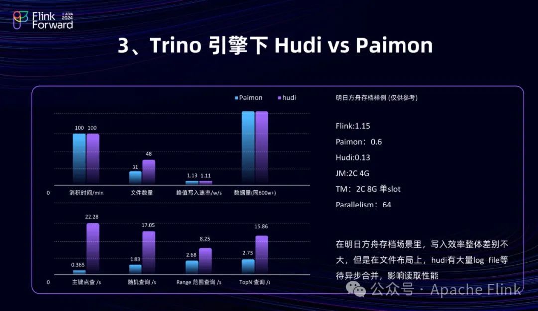 第 3 点是基于 Trino 引擎对 Hudi 和 Paimon 的入湖与读取性能进行对比。以明日方舟存档场景为例,该场景的测试数据量约为 600 万条。在数据消积时间上,可能需要大约 100 分钟。然而,在文件数量方面, Paimon 大约有 31 个数据文件,而 Hudi 则有 48 个,但 Hudi 在文件组织上仍然保留了 500 多个 Log Files。尽管在写入性能上,两者差距不大,但在读取性能,特别是主键点查方面,差异显著。