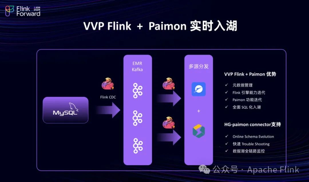 那么最终选择以 Paimon Flink 作为数据湖的入湖存储引擎,是基于 VVP Flink + Paimon 实时入湖的整体链路,这也是一个经典的架构。其流程是通过 MySQL 和 Flink CDC 写入 EMR Kafka,再通过 Flink 多源分发到 Paimon 以及 Connector。这一架构具有多个优势,尤其是在云端功能的增强方面,例如元数据管理、 Flink 引擎能力的迭代以及 Paimon 的功能迭代。