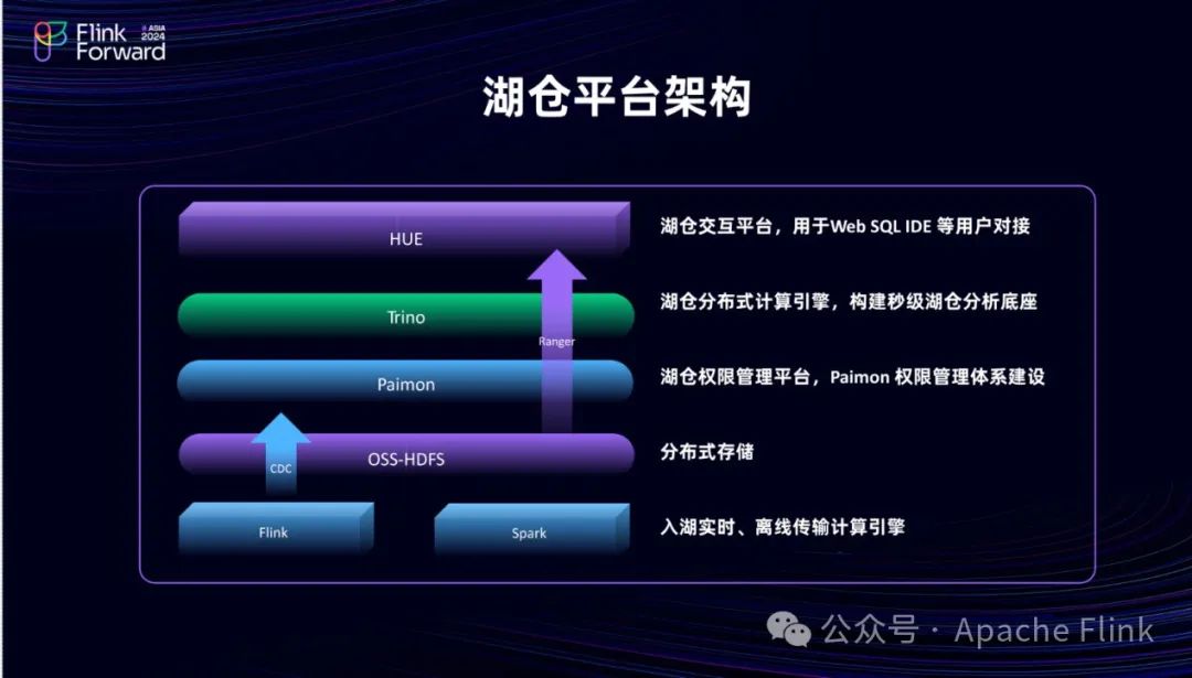 在湖仓平台架构的入湖实施中,选择了 Flink 作为实时传输引擎,通过 CDC(Change Data Capture)技术将数据写入 Paimon 表中。在分布式存储方面,平台采用了 OSS-HDFS。云上离线传输时使用 Spark 作为引擎。对于全量数据入湖的支持,平台可能会采用离线的 Spark 方式进行处理。