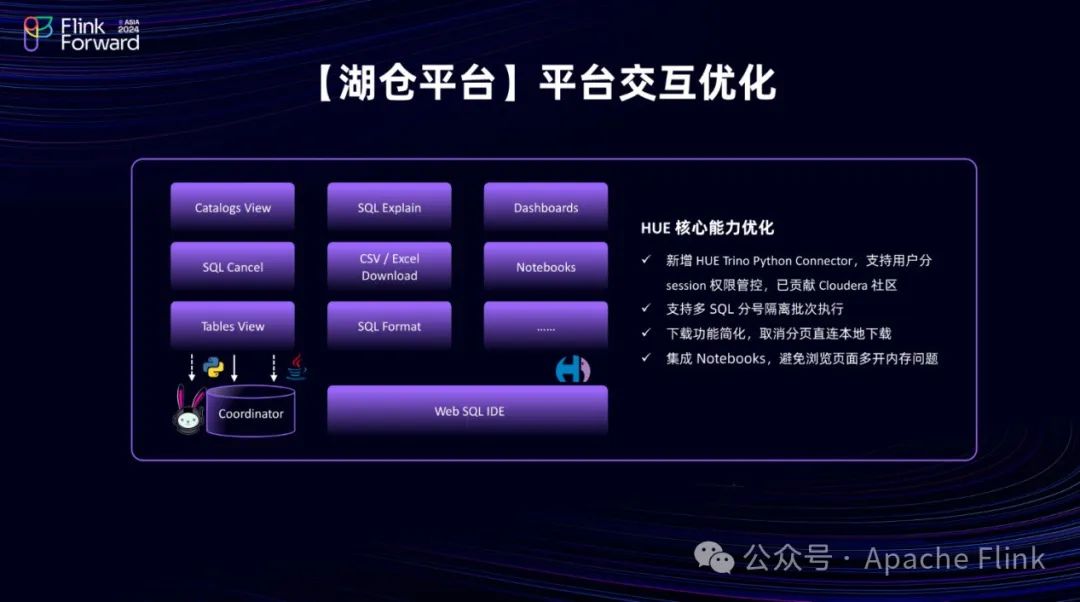 此外,还优化了一些用户常用的功能。例如,支持用户按照分号批量执行 SQL 语句。有些用户需要创建脚本、建表、修改分区等,这些操作可能涉及批量执行 SQL 语句,而在原生基础上并不支持这一功能。另外简化了下载功能,集成了 Notebooks,并修复了原生开源的一些问题。通过这些新的 Feature,完成了平台交互的优化。