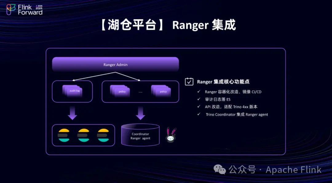 而 Ranger 则是湖仓权限管理平台基础组建。由于 Paimon 以数据资产的形式提供给各个部门,因此每个 BU 的权限管理都依赖于 Ranger 作为底层引擎。