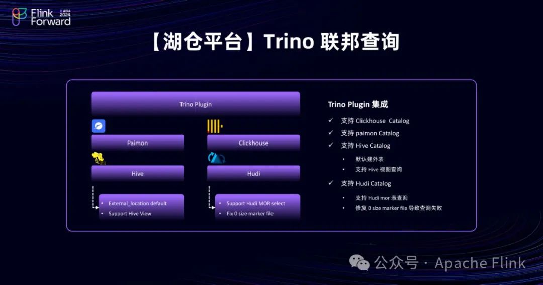 在支持 Hudi Catalog 上增加了 Hudi MOR 表的查询。由于历史原因,部分 Hudi 表尚未迁移到 Paimon 上,但在实时场景下,这些表仍需被读取以处理日志文件。因此,支持了对 Hudi MOR 表的近实时查询,并修复了相关问题。例如,在 Hudi 的某些场景中,可能会出现大小为 0 的 Marker File,这可能导致 Trino 在扫描时将这些无效文件纳入查询范围,从而造成查询卡顿,在内部镜像中对类似的问题进行了修复。
