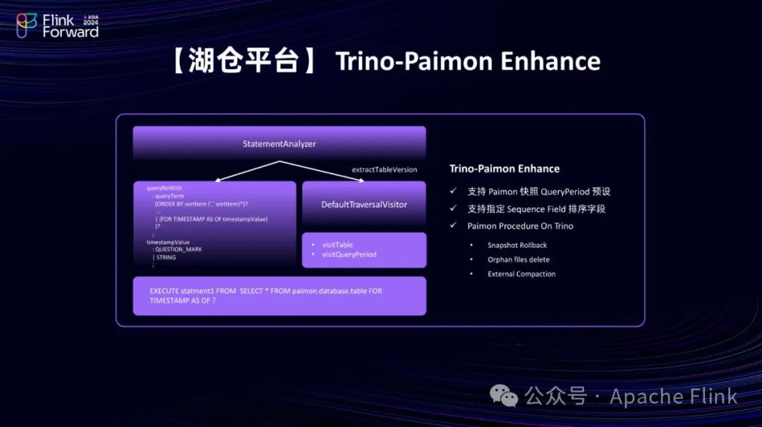 综上所述,通过扩展 Trino 语法、进行二次开发以及引入 Procedure 等方式,增强了 Trino 与 Paimon 的集成能力,并为用户提供了更加灵活和高效的操作方式。