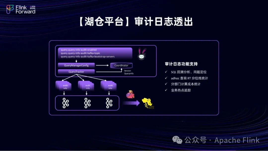 对于审计日志的原生不支持问题,进行了相应的扩展,即在 Trino 的 QueryManagerConfig 中新增了配置选项,包括 Kafka 的配置以及是否开启审计日志透出的管理。在 Coordinator 中,能够获取用户的 Session 信息和 QueryInfo(即 SQL 语句)。随后,在 Flink 中,将这些审计日志发送到 EMR Kafka 中,并进一步通过 Flink 写入到 Hive 表中。这样,实现了审计功能的支持,包括 SQL 回溯、问题定位以及性能诊断等相关功能。此外,还可以进行 Adhoc 查询的 RT 分位线统计。