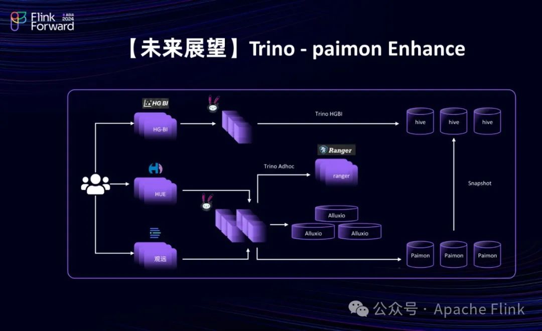 将数据写入Paimon后,其实还未完成全部工作。因为用户需要通过特定的用户入口来访问和使用Paimon表,并了解Paimon表对其数据业务具体场景的支持情况。为了实现这一目标,需要进行湖仓一体化建设。这包括整合像 HUE、Ranger 以及 Trino 这样的组件,以便用户能够顺利接入。