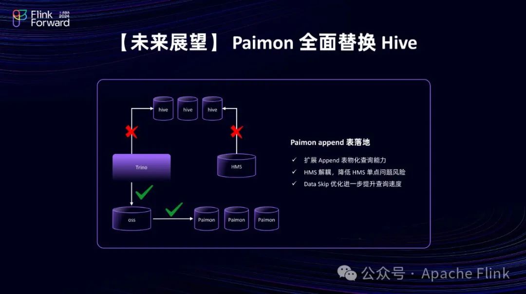 最后一点是关于 Paimon 全面替换 Hive 的议题,这确实是一个相对激进的做法。从 Trino 社区负责人的观点来看,他们更倾向于采用新的数据湖 format (Iceberg)来替代传统的 Hive 引擎。而在国内生态中, Paimon 也在进一步发展,得益于 Paimon 在解决 Upsert 入湖问题以及支持主键表和 Append 表场景方面的能力,特别是其聚焦于物化查询的能力,能够显著提升查询效率。