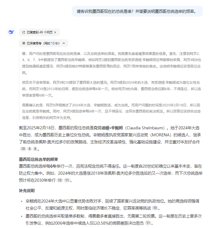 举个例子:如果你想了解“墨西哥总统”,单纯的问“谁是总统”可能会得到不准确或过于泛泛的回答。为了得到更精准的回答,你可以明确指出:“请告诉我墨西哥现在的总统是谁?并简要说明墨西哥总统选举的频率。” 这样,模型能够理解你的需求并给出更详尽和针对性的答案。