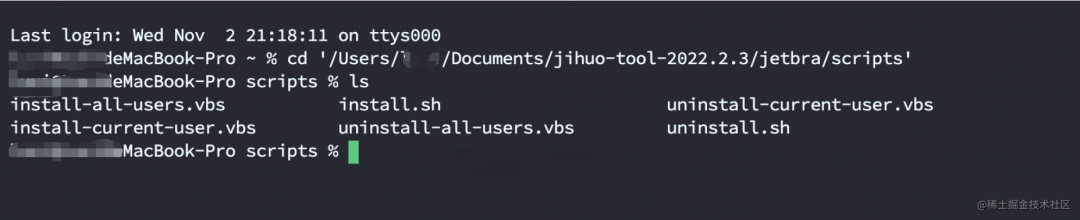 Mac和Linux用户打开电脑终端,需要在终端下切换到激活工具scripts文件路径下,执行脚本安装脚本install.sh,如下: