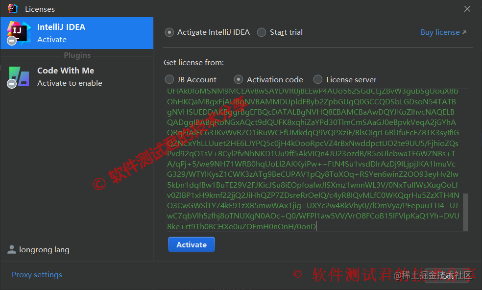 打开IDE,选择Activation Code,添加专属永久激活码,根据自己的IDE选择对应激活码,这里复制IntelliJ IDEA激活码: