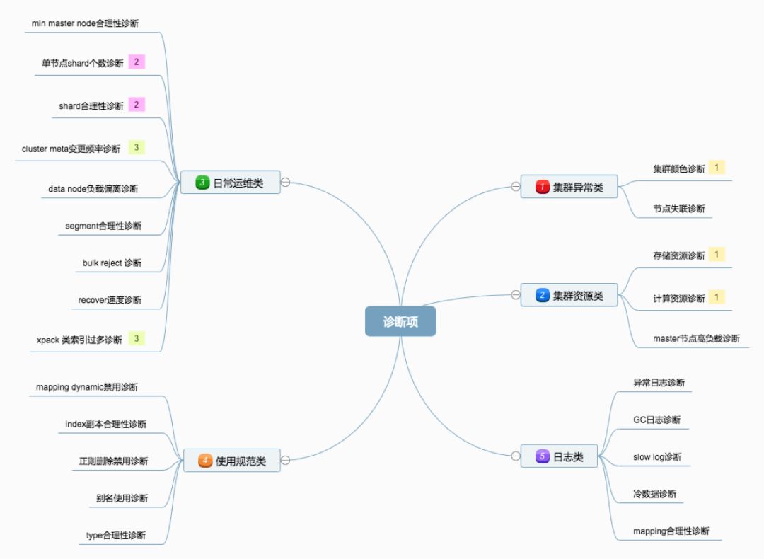 每一个诊断项都有其特定的逻辑策略,这里以集群颜色异常诊断,shard合理性诊断,存储资源诊断这3个出现频率较高的诊断项为例介绍一下。